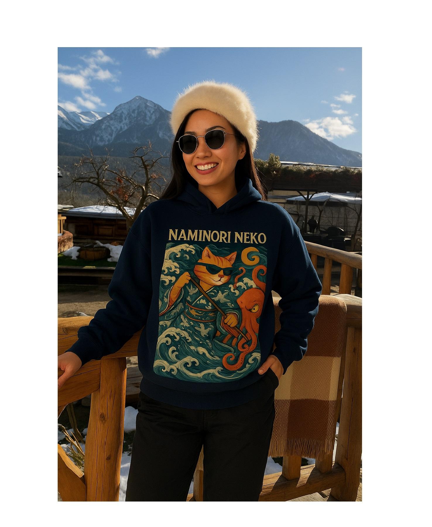 Оригинальное тёмно-синее худи с ярким принтом из серии «Naminori Neko» — харизматичный кот-сёрфер Кайто в схватке с осьминогом на фоне бушующих волн. Японская эстетика и дух приключений сочетаются с уличным стилем и уютом. Худи выполнено из хххххх с добавлением ххххххх, что обеспечивает комфорт, износостойкость и сохранение формы даже после множества стирок. Отлично подойдёт для прогулок, отдыха на пляже или уютных вечеров. Универсальный фасон и глубокий капюшон делают модель удобной и стильной. Состав: ХХ% хлопок, ХХ% полиэстер Уход: машинная стирка при 30°C